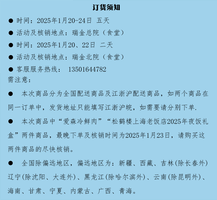 2、本次商品中“爱森冷鲜肉”“松鹤楼上海老饭店2025年夜饭礼盒”两件商品,最晚下单及核销时间为2025年1月23日,请购买这两件商品的尽快核销。